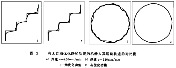 上述兩種機器人各個軸都是作回轉運動,故采用伺取電機通過擺線針輪(RV)減速器(1~3軸)及諧波減速器(1~6軸)驅動。在80年代中期以前,對于電驅動的機器人都是用直流伺服電機,而80年代后期以來,各國先后改用交流伺服電機。由于交流電機沒有碳刷,動特性好,使新型機器人不僅事故率低,而且免維修時間大為增長,加(減)速度也快。一些負載16kg以下的新的輕型機器人其工具中心點(TCP)的最高運動速度可達3m/s以上,定位準確,振動小。同時,機器人的控制柜也改用32位的微機和新的算法,使之具有自行優化路徑的功能,運行軌跡更加貼近示教的軌跡,如圖3所示。