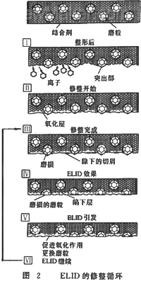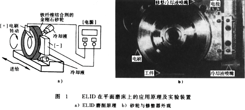 ELID磨削的關(guān)鍵是用與常規(guī)不同的砂輪,它的結(jié)合劑通常為青銅或鑄鐵。圖1是ELID在平面磨床上應(yīng)用的原理及實驗裝置。在使用ELID磨削時,冷卻潤滑液為一種特殊的電解液。當電極與砂輪之間接上一電壓時,砂輪的結(jié)合劑發(fā)生氧化。在切削力作用下,氧化層脫落從而露出了鋒利的磨粒(圖2)。由于電解修整過程在磨削時連續(xù)進行,所以能保證砂輪在整個磨削過程中保持同一鋒利狀態(tài)。這樣既可保證工件表面質(zhì)量的一致性,又可節(jié)約以往修整砂輪時所需的輔助時間。滿足了生產(chǎn)率要求。 #p#分頁標題#e#