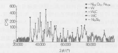 圖1為Cr2WC2Ni60涂層的X射線衍射譜。由圖1可知,物相構(gòu)成主要有Ni3 (Cr, Fe) 、W、WC、W2 C和Ni5 Si2 等,但沒有出現(xiàn)Cr相,表明Cr與Ni基合金相結(jié)合,形成了Ni、Cr化合物。相對應的衍射峰強為: I / I0(W2C) = 78%、I / I0 (WC) = 56% ,膜層上除了有WC和W2C占主要成分外,還有硬質(zhì)相W 存在,這表明WC表面鍍Cr有一定的作用,防止了WC因為溫度高而發(fā)生分解。在噴焊過程中也可以看出,在熔池中有