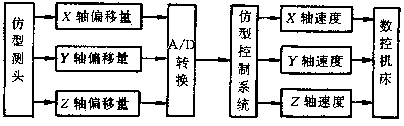數控仿形測量和加工的基本原理如圖1所示。數控仿形測量和加工的過程可以表述如下:數控仿形測量和加工,首先利用三維接觸式或非接觸式模擬測頭檢測實物模型的表面信息(主要指測頭變形偏移量和它在機床坐標系中的坐標值),然后由A/D轉換電路把模擬量轉換成數字量(有些數字化測頭直接輸出數字量)。仿形控制系統根據所測得的信息,按照仿形控制策略分配各個坐標軸的進給速度,并且把所分配的速度送給數控平臺,由數控系統驅動各軸電機,完成仿形測量和加工的全部動作。因此數控仿形加工的控制過程可以概括為數據獲取、數據處理、決策和控制四個階段。