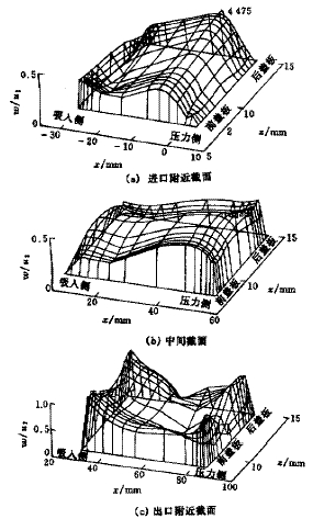 圖3為葉輪進口附近、中間和出口附近截面壓力大小網圖。圖中反映出壓力面附近壓力較吸力面附近壓力大、壓力在出口附近才增加較快等特點,符合葉輪做功原理,同該葉輪的相對速度分布一樣,表現(xiàn)出截面上壓力分布不很均勻的一面。
