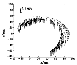 葉片間壓力特點如圖5所示。圖中反映的壓力特征與該種葉輪葉片曲率較大和本計算所采用的葉片壁面壓力邊界條件有關。但我們仍看出壓力大小在葉輪的工作面(壓力面)和出口處較大的葉輪做功基本特點。