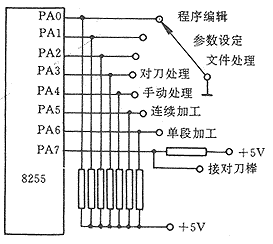 系統功能選擇的方法有幾種不同的方式,使用CRT顯示器作為顯示終端時,可以制作功能菜單,用戶可以通過菜單選擇功能。但經濟型數控系統為了降低成本,一般不用CRT顯示器,而用數碼管組成顯示終端。這時可用波段開關通過并行接口組成功能選擇電路。圖1是由接口電路8255和波段開關組成功能選擇電路的原理圖。在系統啟動后的主程序和以后的各個功能程序中,通過8255循環檢測波段開關的位置,并轉入相應的功能模塊。