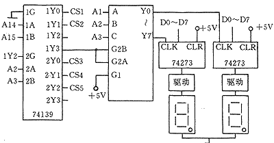 靜態顯示使用的元器件多,電路復雜,每個數碼管有一個段顯示地址,無位顯地址。每個數碼管上有一個鎖存器將要顯示的數據鎖存,這種顯示方法只要不向數碼管送新的數據,其顯示內容不會消失。如果顯示數據不變,不需要顯示刷新,只有在要顯示的數據發生變化時,才需要向顯示器注入要顯示的數據。由于系統中有EPROM(用來存放系統程序),RAM(用來存放加工程序),接口電路8255(用來作輸入、輸出)等,每片內存都要有一定的地址范圍,而數碼管地址可以連續。為解決這個問題可以采用二級譯碼,電路原理如圖3所示。圖中CS1作為系統的EPROM片選信號,CS2作為系統的RAM片選信號,CS3、CS4及CS5作為系統的8255片選信號。3—8譯碼器用來處理顯示,若系統中有多排數碼管時,可以使用多個3—8譯碼器,不同的3—8譯碼器A、B、C端接不同的地址線。