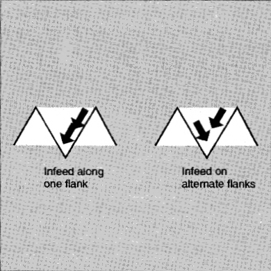 精車時(shí)切削量小,可采用徑向垂直進(jìn)刀,以保證螺紋牙型準(zhǔn)確,精度高,并可獲得好的表面粗糙度。粗車時(shí)切削量大,如果采用徑向垂直進(jìn)刀,考慮到兩條刃同時(shí)切削,因?yàn)檩侒w壁厚較小(δ16mm),輥?zhàn)觿傂暂^差,加工中易產(chǎn)生振動(dòng);徑向垂直進(jìn)刀會(huì)形成V形切屑,切削熱量大,刀尖圓角易過(guò)載,所以我們采用改進(jìn)式側(cè)向進(jìn)刀。這樣可獲得扁平卷曲切屑,排屑良好,切削熱量小,刀具壽命長(zhǎng),如圖7所示。#p#分頁(yè)標(biāo)題#e#