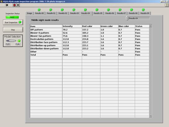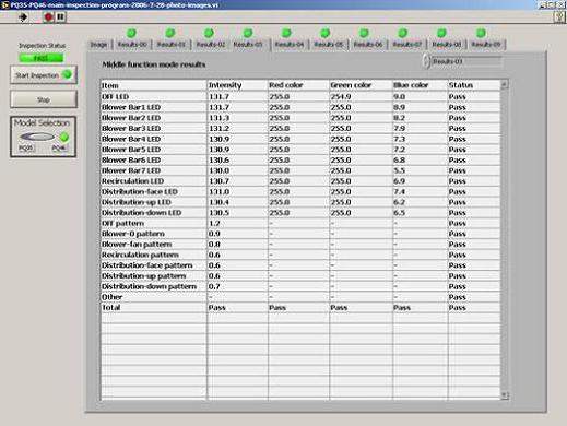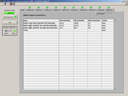測量結果包括圖像和數據,放在一個Table容器中。Table的第一個Page用來存放圖像。圖像以二維數組為容器,分為9行5列,存放45幅圖像,包含9幅采集的圖像和抽取的36幅分量圖層。Table的第2~11共10個Page用來存放測量數據,分別以10張表格形式輸出,分別對應9幅采集的圖像的測量數據和重要特征的全局比較。每個Page上有一個布爾量顯示控件,用于指示當前頁面的綜合判斷結果。