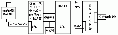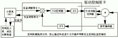 該系統由五部分組成,即計算機(PC)、伺服驅動控制卡、交流伺服調速系統(交流伺服控制器、伺服電機及相應的控制電纜)、傳感檢測及反饋、輔助主動作執行系統。主控程序只有幾百K,運行在DOS操作系統下,主控微機通過打印端口LP1:與伺服驅動控制卡相連,并通過數據線發送位置或速度指令,在線適應性調節或設定PID調節參數(程序設計過程中將其作開放性設計,便于調整)見后附圖,并進行數模(D/A)轉換,通過相應的控制板卡輸出±10V的模擬信號并經過交流伺服放大器放大后驅動伺服電動機,半閉環或閉環位置控制反饋系統由電機軸端裝有的增量式光電碼盤(或在被傳動的物體上設置測量輥和增量式光電碼盤轉換裝置)提供信號(A、B、IN脈沖)來完成位置伺服系統的位置反饋,位置反饋環中傳感元件-增量式光電編碼器將運動構件實時的位移(或轉角)變化量以A、B相差分脈沖形式長線傳輸到現場控制站(PC機)中進行編碼器脈沖計數,以獲得數字化位置信息,主控微機計算給定位置與實際位置(即反饋到的位置)的偏差后,根據偏差范圍采取相應的PID控制策略,將數字控制作用經數模轉換變成模擬控制電壓,并輸出給伺服放大器,最終調節電機運動,完成期望值的反復多次閉環反饋定位控制,在控制原理上實現小誤差高精度的位置定位;然后主控程序對輔助主動作執行系統下達運行指令,完成特定的機械抱閘動作、壓力機在線沖壓運動、液壓停剪切斷運動等。