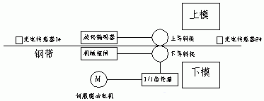 自動送料裝置主要由圖三所示的結構組成,⑴光電傳感器1#主要反饋進入壓力機工作區域的鋼帶存在狀況,如:余料、缺料等;⑵伺服電機經齒輪箱向下導料輥傳遞輸送動力,齒輪箱的傳動比i(如i=11的設計選型)和電機的轉速決定該系統送料定位速度;⑶旋轉編碼器測出上導料輥(被動送料及被動測量點)通過與板料間的運動傳遞的位置信號⑷機械抱閘實現定位后的位置固定;⑸光電傳感器2#實現壓力機的工作控制要求的位置信號的傳遞;⑹上下模實現在線孔位的沖壓;要求壓力機沖壓噸位配套、機床或模具精度的配套等。