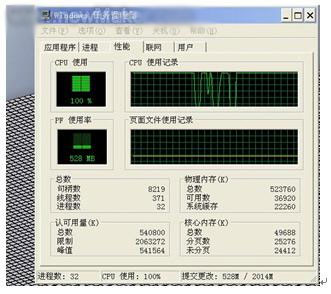 (1)在SolidWorks使用過程中啟動Windows任務管理器,在性能頁,如果CPU的占用率經常在100%,那么系統瓶頸就在CPU或顯卡,建議升級CPU或顯卡;如果系統內存大部分被占用,虛擬內存使用量又很大,操作過程中硬盤燈頻繁閃爍,這說明系統瓶頸在內存,建議擴大內存。以筆者的個人計算機為例:如圖1包含2500個立方體的裝配體,CPU利用率正常,內存偏低,系統操作性能有些下降。如圖2包含10000個立方體的裝配體,CPU利用率100%,物理內存不夠,啟動了虛擬內存,此時系統操作性能急劇下降,無法正常進行設計工作。