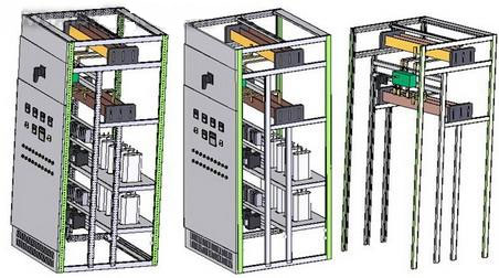 裝配體設計過程中,設計人員一般針對裝配體某個模塊進行集中操作。如圖5的電控柜,設計人員分別設計電容、熔斷器、柜門、銅牌等模塊。設計銅牌時,熔斷器、柜門和開關等與銅牌沒有任何關聯,它們的存在不僅降低系統性能,還會干擾設計人員的視線。所以設計銅牌時,設計人員通過壓縮熔斷器、柜門等不相關的零部件,就能明顯提高插入和重建模型的速度。圖5中 a)、b)、c)分別給出未簡化、簡化和使用裝配體配置的三種圖例,分析如下: