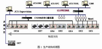 概述 位于安徽省天長(zhǎng)巿的天長(zhǎng)缸蓋有限公司是國(guó)內(nèi)最大的汽缸蓋生產(chǎn)廠之一,為多家柴油機(jī)廠配套生產(chǎn)不同類(lèi)型不同規(guī)格的缸蓋。該廠的缸蓋生產(chǎn)覆蓋了鑄造模具制造、鑄件生產(chǎn)、缸蓋機(jī)加工與檢驗(yàn)的整個(gè)過(guò)程。他們?cè)跈C(jī)加工過(guò)程中大量采用加工中心,并在新近上馬的一條缸蓋準(zhǔn)柔性生產(chǎn)線中采用了15臺(tái)KT1500立式加工中心和4臺(tái)TH6363臥式加工中心,配置了適應(yīng)不同規(guī)格型號(hào)的工裝夾具,具有四缸/六缸柴油機(jī)缸蓋加工的能力。 該生產(chǎn)線采用了北京機(jī)床研究所的JCS車(chē)間信息集成技術(shù)來(lái)構(gòu)建生產(chǎn)線管理系統(tǒng)。管理系統(tǒng)包括:JCS-DNC生產(chǎn)線數(shù)據(jù)交換網(wǎng)絡(luò)、JCS-TOOL刀具與工夾具管理子系統(tǒng)、JCS-SFC生產(chǎn)線作業(yè)管理子系統(tǒng)、JCS-Ethernet機(jī)床狀態(tài)監(jiān)控子系統(tǒng)和JCS-Supervision生產(chǎn)線終端等子系統(tǒng),其生產(chǎn)線結(jié)構(gòu)簡(jiǎn)圖如圖1所示。