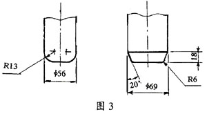 設(shè)想分二道引伸工序達到所需高度。為達到最大限度利用翻邊孔底部周圍材料厚度,使二道 引伸均勻利用周邊材料厚度的目的,將二道引伸工序的凸模設(shè)計成不同的形狀和直徑(見圖3 )