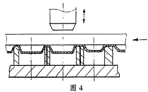 引伸、沖孔時以凸形定位,翻邊時以中心底孔定位。在第二道引伸時,要以前道凸形與該道 引伸后凸形同時定位(見圖4),且中心距應(yīng)按收縮量放大。這樣做既能起定位作用,又能起 到阻止中心節(jié)距收縮的作用。翻邊時同樣前后同時定位,以確保中心距尺寸無誤。