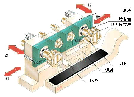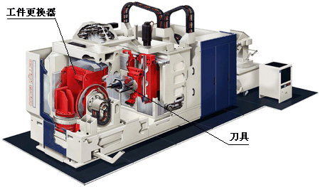 高速干切削對機床的基本要求,首先必須是高速機床,要有較高的切削速度和進給速度,同時結構上要有利于快速排屑,并有較高的熱穩定性。內置的高速電機主軸是機床實現主軸高速運轉的最佳選擇,目前可選的高速主軸轉速從10,000r/min到150,000r/min ,功率從0.5kW到80kW,可以滿足不同的切削需要;快速進給系統可以采用改進的滾珠絲杠或直線電機,進給速度可以達到60~180m/m/min,加速度可達19.6~98m/s2,完全滿足快速進給的需要。因此,在高速機床日益普及的今天,高速干切削對機床的要求主要針對機床的整體結構和輔助設施,機床床身是保證機床穩定性的基礎大件,應采用熱穩定性較好的整體鑄造的框架式或龍門式結構,最好應用絕熱材料“人造花崗巖”或新型均熱材料(如在鋁材料中添加20%的碳化硅得到的新型復合材料),增加絕熱傾斜蓋板。機床整體結構盡量簡單,盡可能采用方便排屑的立式主軸布置,工作間寬敞明亮,內部減少凸臺、凹槽,方便排屑,密閉工作間內增加通風設施。如圖1是MURATEC公司的MW系列雙塔干式車床模型,其主體結構對稱,排屑簡單方便,采用雙主軸平行布置,帶有12刀位轉塔,有很高的加工效率,適合于鑄件、淬硬鋼。圖2所示的加工中心是Hueller Hille公司專門為干切削設計的specht 500T型高速加工中心,這種加工中心最大的特點就是有一個可沿水平軸轉動的工件更換器,利用這種工件更換器,工件在裝料側處于正常位置,而在工作間里則是自上而下懸掛著進行切削,使切屑可以從上面自然落下。其主軸轉速高達25,000~60,000r/min,主電機功率60kW, 帶有液氮冷卻系統,結構簡單,排屑可靠,很適于對鋁合金或纖維增強塑料等進行高速干切削。