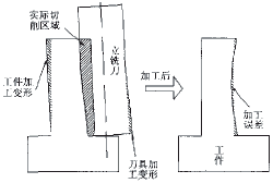 - 通過加工變形模擬分析,得到的工件在加工過程中的變形分布狀況和趨勢。由于加工變形產生讓刀誤差,其結果必然產生一定的尺寸誤差(如圖5(a))。為了有效補償這種因上件剛性不足而產生的加工變形,可以讓刀具偏擺一定的角度(如圖5(b))。刀具偏擺數控補償,即是根據模擬分析加工變形的大小,在數控編程時讓刀具在原有走刀軌跡中按變形程度附加連續偏擺,補償因變形而產生的讓刀量。通過刀具偏擺數控補償,可以將讓刀殘余材料基本切除,一次走刀即可保證薄壁件壁厚精度。