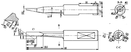針閥體挖槽刀(見圖)屬于小型型腔類加工刀具,幾何形狀復雜(多為空間角度)。對刀具的加工精度和表面粗糙度均有較高要求。由于沒有該刀具的圖紙,只能采取實物測繪,但很難保證測繪精度。此外,我廠沒有微型零件加工設備,用普通機床加工難度較大。鑒于此,課題小組確定的基本研制目標為:①刀具基本達到使用要求,可加工出合格產品;②刀具的耐用度達到進口刀具的50%(大約可加工500件工件)。