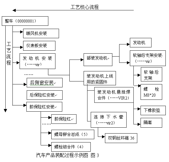 對(duì)汽車制造業(yè)來說,MBOM的關(guān)鍵是產(chǎn)品的物料間核心制造裝配。因此,從工藝文件中找到這些物料的核心制造裝配關(guān)系,就可以得到MBOM。這就是基于核心工藝流程構(gòu)造MBOM的核心思想。其關(guān)鍵在于如何表示產(chǎn)品工藝關(guān)鍵流程。