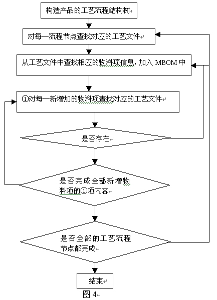 產(chǎn)品工藝流程節(jié)點(diǎn)對(duì)應(yīng)著生產(chǎn)中的某個(gè)或某些物料項(xiàng)。這是因?yàn)楣に嚵鞒坦?jié)點(diǎn)的本質(zhì)是一個(gè)或一組工藝過程,這個(gè)工藝過程必然要輸出物料項(xiàng)。而為了制造這個(gè)輸出物料項(xiàng),一定會(huì)有若干個(gè)輸入物料項(xiàng),這些輸入物料項(xiàng)要么是上一個(gè)工藝流程節(jié)點(diǎn)的輸出物料項(xiàng),要么就是初始狀態(tài)物料項(xiàng)。因此說一個(gè)工藝流程節(jié)點(diǎn)必然對(duì)應(yīng)著一個(gè)物料項(xiàng)。既然工藝流程節(jié)點(diǎn)對(duì)應(yīng)著物料項(xiàng),那么就可以用相應(yīng)的物料項(xiàng)去"替代"工藝流程結(jié)構(gòu)樹中的流程節(jié)點(diǎn),實(shí)現(xiàn)根據(jù)工藝流程節(jié)點(diǎn)所對(duì)應(yīng)的工藝數(shù)據(jù),一般主要指工藝規(guī)程。工藝規(guī)程中的信息表明了該工藝流程所要加工或制造商的物料項(xiàng),而且其編碼是唯一的,可以作為MBOM的節(jié)點(diǎn)。如果是加工工藝規(guī)程,則指明了所需要的原材料或毛壞;如果是裝配工藝規(guī)程,則列舉了為裝配該物料項(xiàng)所需要的其他全部物料項(xiàng)以及相應(yīng)的數(shù)量。原輔材料、毛壞和子裝配件都作為該物料項(xiàng)的子節(jié)點(diǎn)出現(xiàn)在MBOM中。通過父子節(jié)點(diǎn)關(guān)系定義子節(jié)點(diǎn)的來源屬性和使用部門。這樣,根據(jù)工藝流程,結(jié)合工藝流程節(jié)點(diǎn)的工藝信息,就可以構(gòu)造出產(chǎn)品的MBOM,其核心算法如下圖所示: