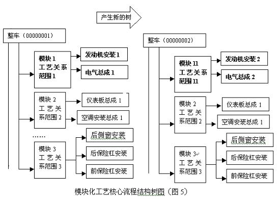 模塊化結(jié)合形成產(chǎn)品制造工藝結(jié)構(gòu)樹,簡(jiǎn)化工藝結(jié)構(gòu)樹的管理,根據(jù)模塊間與整車的關(guān)系,利用參照樹的關(guān)系可以新的制造產(chǎn)品結(jié)構(gòu)樹,實(shí)現(xiàn)精益物料與精益工藝的完美統(tǒng)一。如圖5所示。