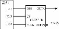 串行數據通過P2.1口輸入TLC5618,串行時鐘通過P2.2輸入,P2.3接片選端。