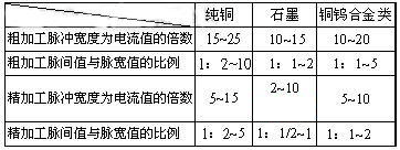 根據電極材料的性能,選用合適的電參數發揮材料的加工優勢,處理好其加工中的缺陷問題。因使用機床的不同,這里提供一組主要電參數選用關系的數據表供參考,如下表所示(參數數值為具體值)。