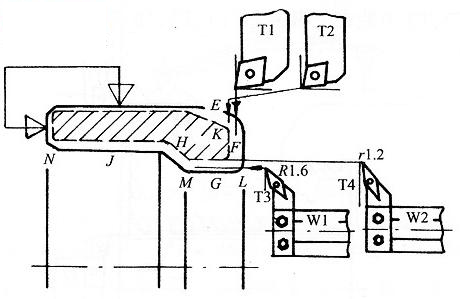一種需要大批量車削的密封座,毛坯為鍛件,其車完后的剖面形狀如圖2內虛線所示。原來的工藝流程為3道粗車、1道半精車、2道精車、共6道工序。采用C7620液壓半自動車床和C7220仿形車床,加工后外徑橢圓度有時達不到圖紙0.12mm的要求。 通過分析和反復試驗,縮短了工藝流程。只用3道工序就完成全部粗、精加工,其加工精度也達到了圖紙要求,而且只使用了一臺數控車床。 第一道工序見圖1,卡小內徑,用C7620半自動車床,車削A、B面和C、D倒角。第二道工序見圖2,用一臺雙刀臺數控車床,卡已經粗車過的外徑。上刀架安裝兩把80。等邊菱形刀片的端面外徑刀,T1裝邊長16的刀片,用于F、E面和K倒角的粗車, 圖2 第2工序裝邊長12的刀片,用于這3處的精車。下刀架安裝兩個自制刀座W1和W2,在各自的頭上安裝55。等邊菱形刀片的端面外徑刀,這兩把刀的型號及刀片的邊長相同。只是T3用的刀片的刀尖圓弧半徑為1.6mm,T4用的刀片的刀尖圓弧半徑為1.2mm。T3、T4分別作H、J面和L、M、N角的粗車和精車,編相應的數控加工程序后,就可以進行車削。第三道工序,使用C7620半自動車床,用彈簧卡具卡小內徑G,并用端面F定位,精車外徑A、端面B和外角C。 通過大批量生產實踐應用,采用上述方法把工藝流程縮短了一半,是成功的。