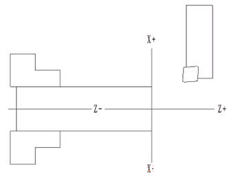 數(shù)控車床同樣使用笛卡兒坐標系定義編程坐標系,只是坐標軸不同于數(shù)控銑床而已。數(shù)控車床根據(jù)習慣,將平行于機床主軸的軸定義為Z軸,而垂直于機床主軸的軸定義為X軸。圖1說明了這點,坐標軸的方向定義為,Z正向定義為主軸的右側(cè)方向,朝向機床的背方向定義為X正向。這主要考慮到典型的數(shù)控車床刀架安裝在機床的背部(面向操作者)。原點通常設(shè)在要加工零件的前端面的中心。
