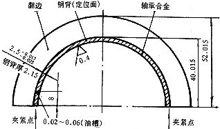 軸瓦是用于發動機內曲軸軸頸等部位的滑動軸承,其構成是由一種以鋼帶為襯底、表面附著一層軸承合金的雙金屬鋼帶,并通過一系列的加工而成。這層軸承合金通常有三種:巴氏合金、鋁錫合金和銅鉛合金。本機是為紹興紡織機械廠設計制造的用于加工EQ140-1主軸翻邊瓦(圖1)的內圓精加工拉床。此主軸翻邊瓦的軸承合金為鋁錫合金,拉床切削的部分即為軸承合金層部分。