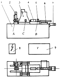 1.托料板 2.集料槽 3.彈簧 4.隔料板 5.螺母 6.頂料口 7.撞塊 8.滑臺 9.支架 #p#分頁標題#e#