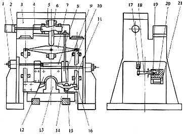 1.微調螺母 2.夾緊油缸 3.夾具體 4、6、10.拉桿 5.斜槽滑塊 7.平衡杠桿 8、9.微調斜塊 11.壓板 12、21.拉胎 13.刀具 14.滑臺 15.轉軸 16.轉銷 17.打料油缸 18.打料杠桿 19.擋塊 20.打料滑塊相關文章