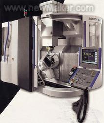 2. 五面加工和五軸聯動加工中心:為了克服普通鏜銑加工中心存在的上述工藝局限性,人們在以普通鏜銑加工中心為基礎,將原來固定指向的主軸頭換成可以立、臥自動轉換的主軸頭和采用可回轉分度的工作臺,這樣的機床就可以在工件一次裝夾的條件下,獲得5面(如箱體類工件)甚至更多面的加工能力,成為5面乃至多面加工中心。如果將普通鏜銑加工中心的主軸換成具有數控單擺(A或B軸)或雙擺(C和A或B軸)功能的電主軸,或在工作臺上配上具有C軸或C和B軸轉動功能的數控回轉工作臺,當然還有相應的5軸聯動控制的數控系統,則機床就發展成為五軸聯動的加工中心。圖2為米克朗公司生產的5軸聯動立式加工中心。其三個直線軸分配在主軸頭和工作臺上,兩個回轉軸則由回轉工作臺來完成。