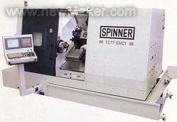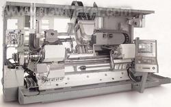 . 車削中心:通常是以普通數控車床為基礎,配以一個或多個具有多刀位的轉塔刀架發展而成,加工對象主要是軸類和盤套類等回轉體零件。由于回轉體件中約有一半左右的零件,除主要需車削加工外,還需部分的銑削、鉆削和攻絲等加工,因此為了在一臺車床上一次裝夾便可對回轉體件進行全部或大部分的加工,車削中心的轉塔刀架上,除了裝有車削刀具外,還能裝上銑刀、鉆頭和絲錐等旋轉的動力刀具,而且機床主軸具有數控精確分度的C軸功能和C與Z軸或和C與X軸聯動的功能。這樣一臺車削中心不僅可以像普通數控車床那樣能對回轉體件的內外表面(含圓柱面、錐面、曲面等)、端面進行車削加工,還可以利用C-Z軸聯動功能車螺紋,利用C軸分度功能和刀架的X或Y軸控制以及其上的動力旋轉刀具進行偏離回轉體件中心線的鉆孔和銑削,從而大大地擴展了數控車床復合加工的能力。圖3是SPINNER公司車削中心。但是,對于單主軸的車削中心而言,無論其工藝能力如何擴大,也無法解決回轉體件一次裝夾下的背面(原裝夾端)二次加工問題,這正是單主軸車削中心存在的不足和開發新型車削中心的原因所在。