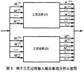 1.2.2產品制造過程的資源消耗和環境影響分析模型產品制造的整個過程資源消耗和環境影響的分析,則可在工序層次上的物料輸入輸出集成的基礎上進行.以制造過程中的兩個加工工藝集成為例進行說明,如圖3所示.