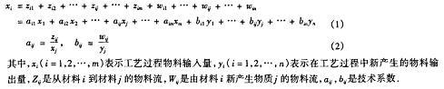 表的左列表示工藝過程的物料輸入量,頂行表示物料輸出量,其它元素描述的是從輸入到輸出的物料流,如Z12表示從材料M1到材料M2的物料流,W1n表示材料M1新產生的物質Yn的物料流。假定工藝過程的輸入和輸出之間有一定的線性關系,基于物質守恒定律,則有