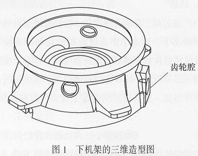 下機(jī)架是圓錐破碎機(jī)的主要結(jié)構(gòu)件,也是圓錐破碎機(jī)其他部件的裝配基礎(chǔ)。此次我廠承攬的這種結(jié)構(gòu)的下機(jī)架以前從來(lái)沒(méi)有生產(chǎn)過(guò),不能借用過(guò)去的工藝思路,只能另辟蹊徑。通過(guò)分析鑄件結(jié)構(gòu),綜合考慮冒口放置、模樣結(jié)構(gòu)和澆注系統(tǒng)等方面內(nèi)容,設(shè)計(jì)出合理的工藝方案,生產(chǎn)出了用戶(hù)滿(mǎn)意的鑄件。
