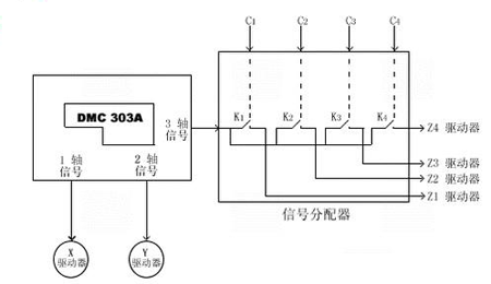 當C1有效時,開關K1閉合,DMC303A的Z向信號經分頻器送到驅動器Z1上,實現對Z1軸的可選擇性控制,依次類推。當C1、C2、C3、C4同時有效時,開關K1、K2、K3、K4同時閉合,使得Z向四軸能夠同時運動。鑒于我們的四軸數控鉆床Z1、Z2、Z3、Z4工作軸的運動是同步運動或同步靜止兩種狀態,所以可以通過C1、C2、C3、C4的預先設置,來實現一路信號控制四個軸的運動。無油軸承
