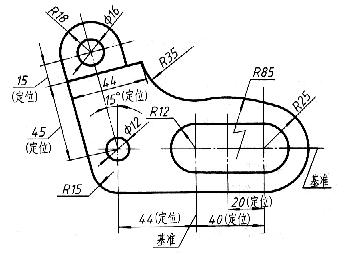應該說明的是,有時某些尺寸既是定位尺寸,又是定形尺寸(如圖1中的兩R12圓弧中心距40和圖形中左上方的傾斜尺寸44)。尺寸基準也只有在確定線段間的相對位置時才有意義。定位尺寸也是圖形某一方向尺寸的主要基準與輔助基準間相互聯系的尺寸。
