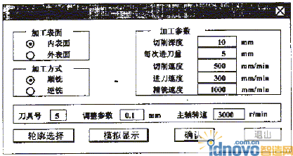 為了使用操作方便,要用DCL語言設(shè)計一個操作對話框,如圖2所示。在這個對話框中,通過按下選擇輪廓按鈕(在圖形上選取加工輪廓線,并獲得坐標信息)、選擇零件表面和加工方式(以確定刀具的運動方向)、輸入調(diào)整參數(shù)和刀具號(確定刀具中心和輪廓線的偏移量)等操作后,就可用模擬顯示按鈕,在AutoCAD圖形編輯器中直接進行刀具運動的二維仿真模擬顯示;觀察滿意后,再分別輸入切削深度、每次進刀量、切削速度、進刀速度、精銑速度、主軸轉(zhuǎn)速等編程加工參數(shù),按下確認按鈕,即可將完整的數(shù)控加工程序輸出到指定的文本文件中。