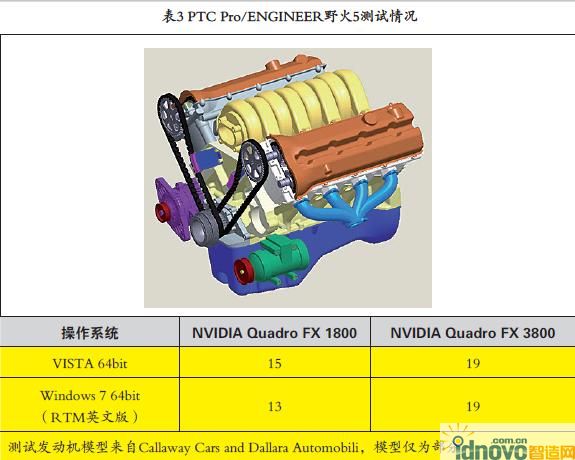我們同樣對(duì)PTC Pro/ENGINEER野火5 進(jìn)行了測(cè)試,結(jié)果如表3所示。測(cè)試采用 了性能更為強(qiáng)大的NVIDIA Quadro FX 1800 和NVIDIA Quadro FX 3800,只有這兩片專 業(yè)顯卡,才能發(fā)揮野火5.0的威力。野火5.0的測(cè)試規(guī)模較大,未采用32位系統(tǒng)。 從測(cè)試來看,野火5.0是硬件殺手, 即使高端的NVIDIA Quadro FX 3800,在打 開實(shí)時(shí)渲染后也無法到20幀/s的水平,盡 管大部分操作還算流暢,但還是存在偶 爾的停滯現(xiàn)象。我們強(qiáng)力建議升級(jí)野火5.0的用戶,選擇NVIDIA Quadro FX 3800顯 卡,甚至采用SLI NVIDIA Quadro FX 3800。當(dāng)然,犧牲圖像效果,關(guān)閉動(dòng)態(tài)實(shí)時(shí) 渲染、陰影和反光也是一個(gè)辦法,速度 會(huì)明顯加快。不過,模型觀感就和野火4沒什么區(qū)別了。