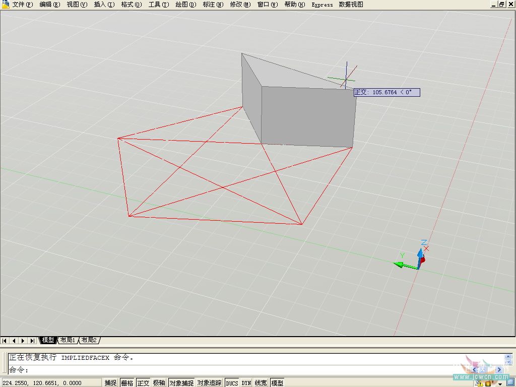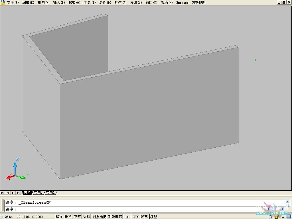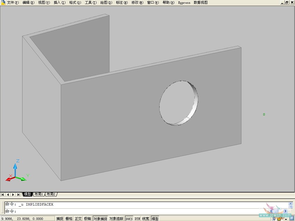 打開動態UCS(快捷F6),暫時把UCS定在斜墻上,然后畫個圓(動態UCS也是新功能,以后詳細介紹)