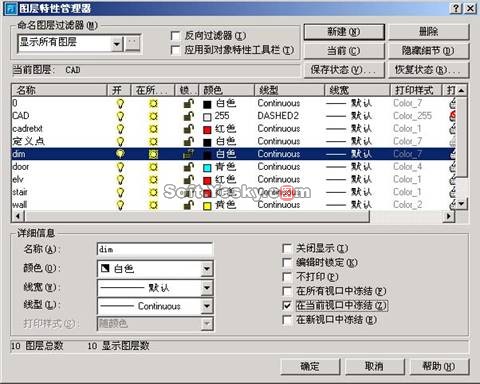 如果僅需要在當前視口不打印某一圖層,如在當前視口不打印標注尺寸層,具體設置方法,用鼠標雙擊當前視口進入圖紙空間中的模型空間(一定要進入 視口里,否則無法對當前視口圖層控制),打開圖層特性管理器,選中要在單前視口中凍結的圖層,在“在當前視口中凍結”。