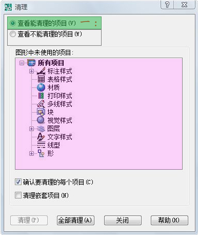 從圖形中刪除所有未使用的命名對象,即使這些對象包含在其他未使用的命名對象中或被這些對象所參照。 顯示“確認清理”對話框,可以取消或確認要清理的項目。