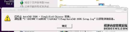 今天,我們分公司遇到一個AUTOCAD2006的安裝問題,在安裝AUTOCAD2006簡體中文版本的時候,出現(xiàn)如下提示:“已終止AutoCAD 2006-simplified chinese安裝,請檢查:C:Docume~1/ADMINI~1LOCALS~1TempAutoCAD2006 Setup.log以獲取詳細(xì)信息”