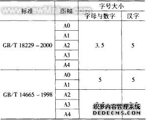 GB/T 18229在“CAD工程圖的字體高度與圖紙幅面之間的關(guān)系” 及“CAD工程制圖的字體選用范圍” 兩項(xiàng)內(nèi)容與現(xiàn)行標(biāo)準(zhǔn)不同。GB/T 18229規(guī)定,不論圖幅大小,圖樣中字母和數(shù)字一律采用3.5號(hào)字,漢字一律采用5號(hào)字。GB/T 18229與GB/T 14665的對(duì)比見(jiàn)表4。