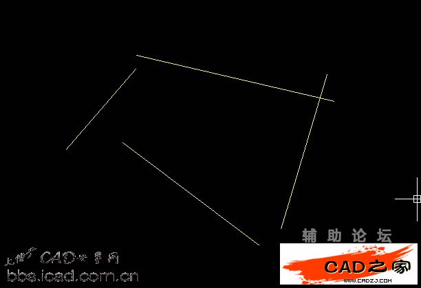 現在要通過編輯這四條直線來組成一個四邊形,直接的方法當然是用延伸和剪切命令(其實加上Shift鍵,兩個命令可相互替代)。但我們可以用倒圓角的命令,在輸入倒圓角命令(CHAMFER)后,對圓角半徑R改為0,再分別選擇四個頂點對應的直線就能完成編輯得到所需的四邊形了,比用延伸和剪切要明了快捷。如下圖: