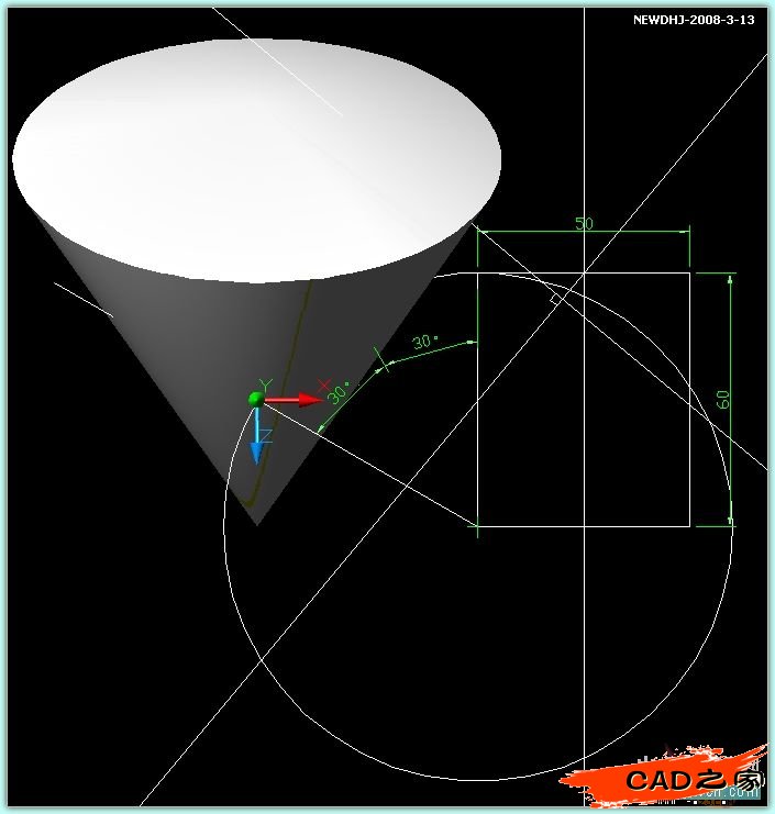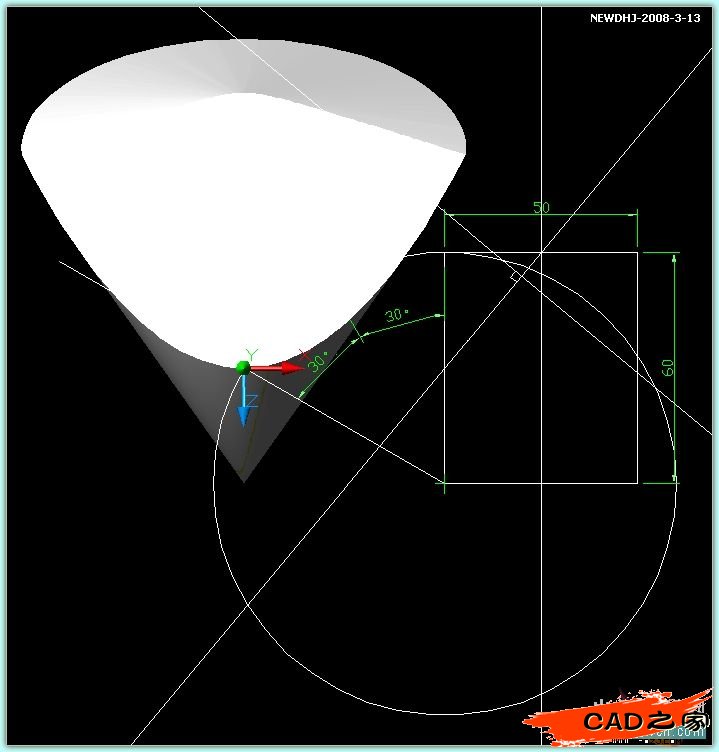 8、以原點(0,0,0)平面(zx)剖切圓錐體,保留后面部分,出現(xiàn)半個橢圓面