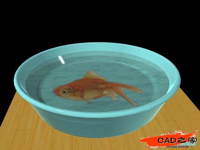 5、如果在盆中再創建兩個面域并附給不同的金魚材質(仍為透明與不透明圖片相配套的圖片),那么在“視圖樣式/真實”的界面中所得截圖如下。