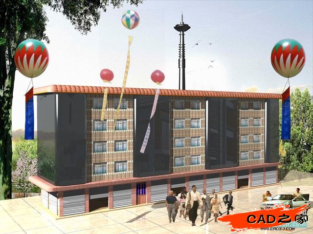下面是這次添加了電視塔后用CAD2008渲染的效果圖: