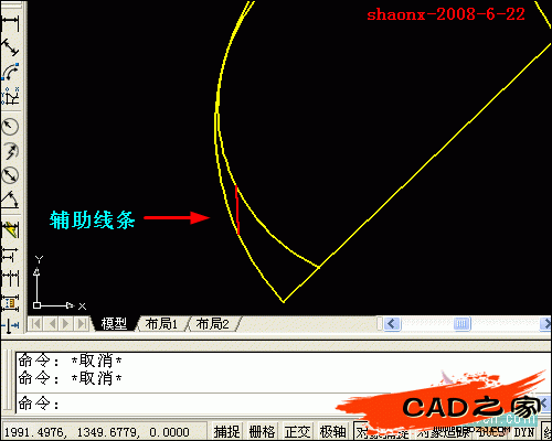 如上圖,在左下角這個狹長的區域作面域,應按照作面域的第二種方法,但提示:“找不到邊界”等,無法做成面域,我的解決方法是:在區域內加輔助線條,如圖中的紅色線條,以縮小做面域的區域,如上圖,加了1條輔助線條后,就可以做成2個面域,再合并,刪除輔助線條,即做成1個面域。