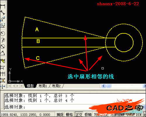 4、在圖形界面里點擊扇形周圍相鄰的線條后,回車。